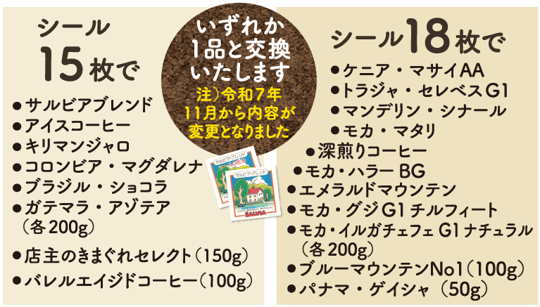 発送にて交換 … 集まったシールと住所、氏名、電話番号、交換する商品、豆挽を書いた紙を封筒に入れてご郵送ください。